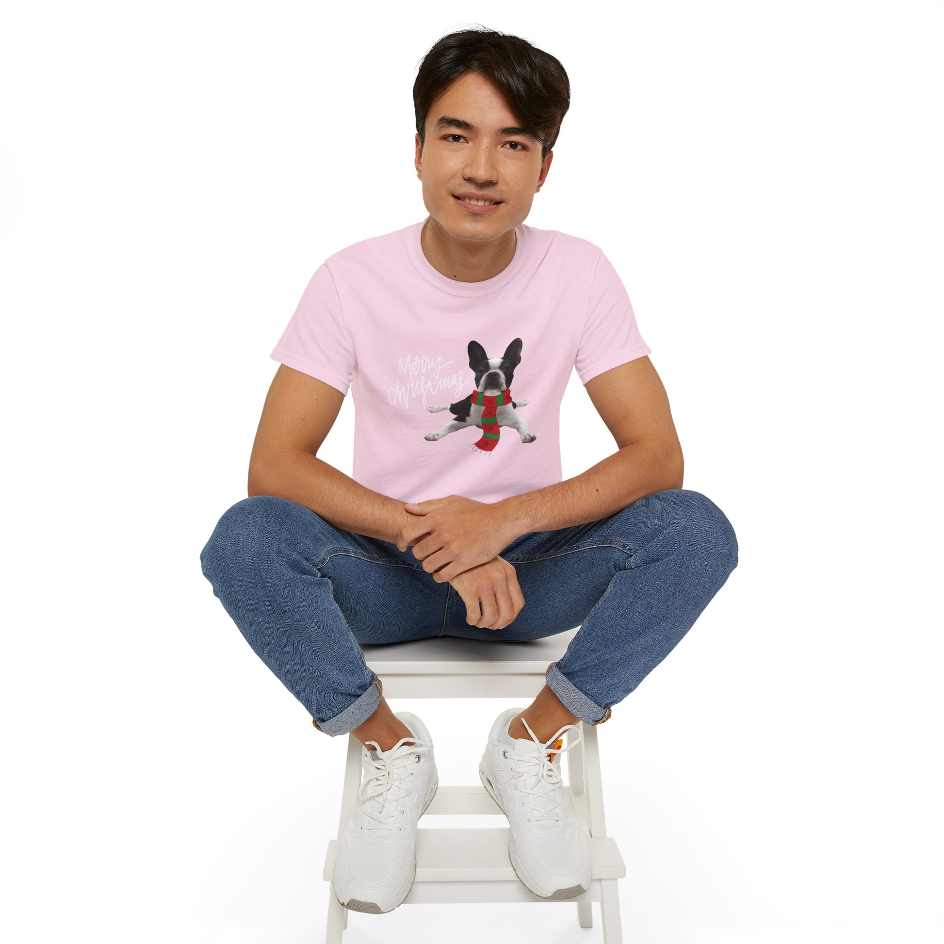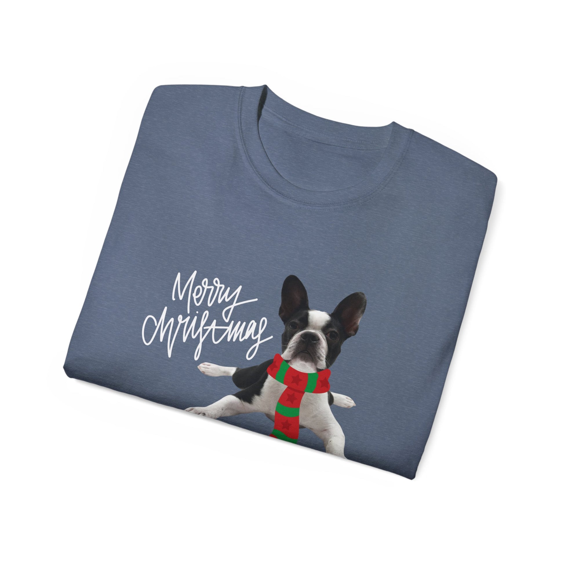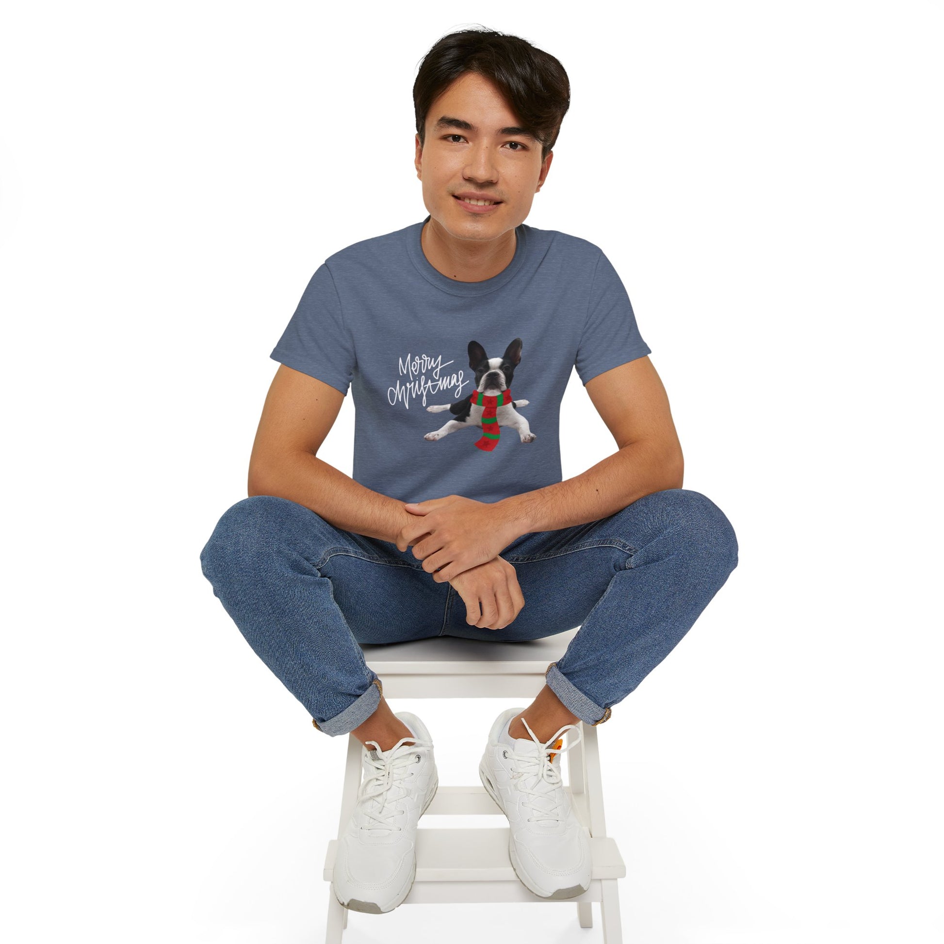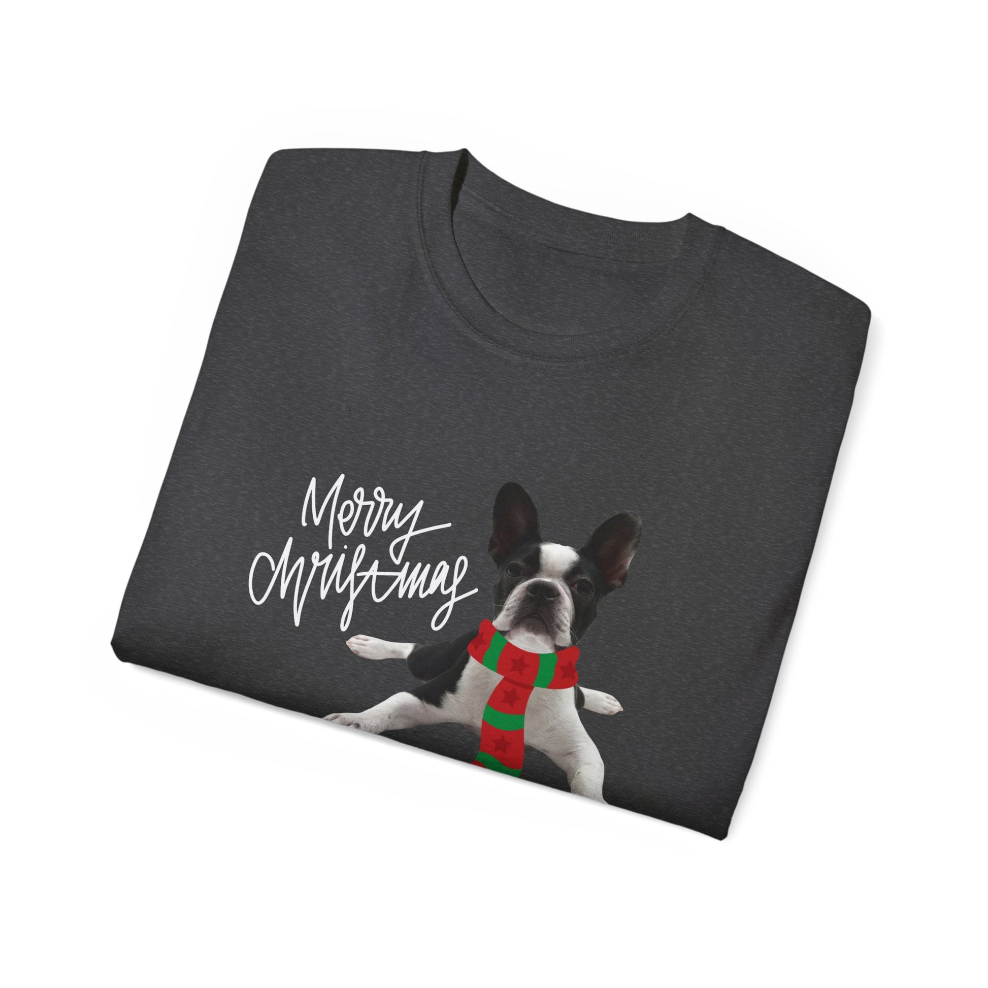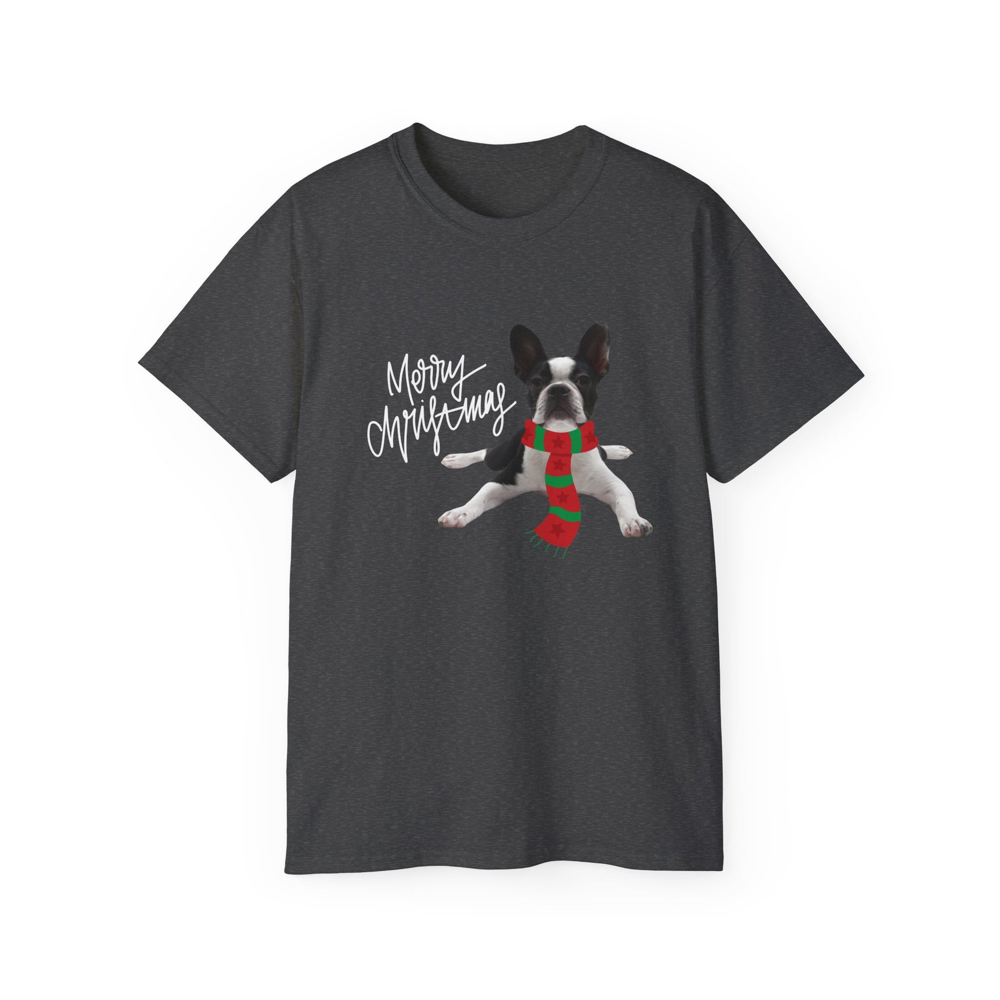 A cute Boston Terrier design tee perfect for the Boston Terrier lover. The design features a holiday expression of joy with the dog wearing a Christmas scarf, giving a festive and cheerful vibe. This unisex tee is ideal for adults who love Boston Terriers and want to add a touch of holiday spirit to their wardrobe. Suitable for everyday wear and can be a great gift for Christmas or any dog lover's special occasion.