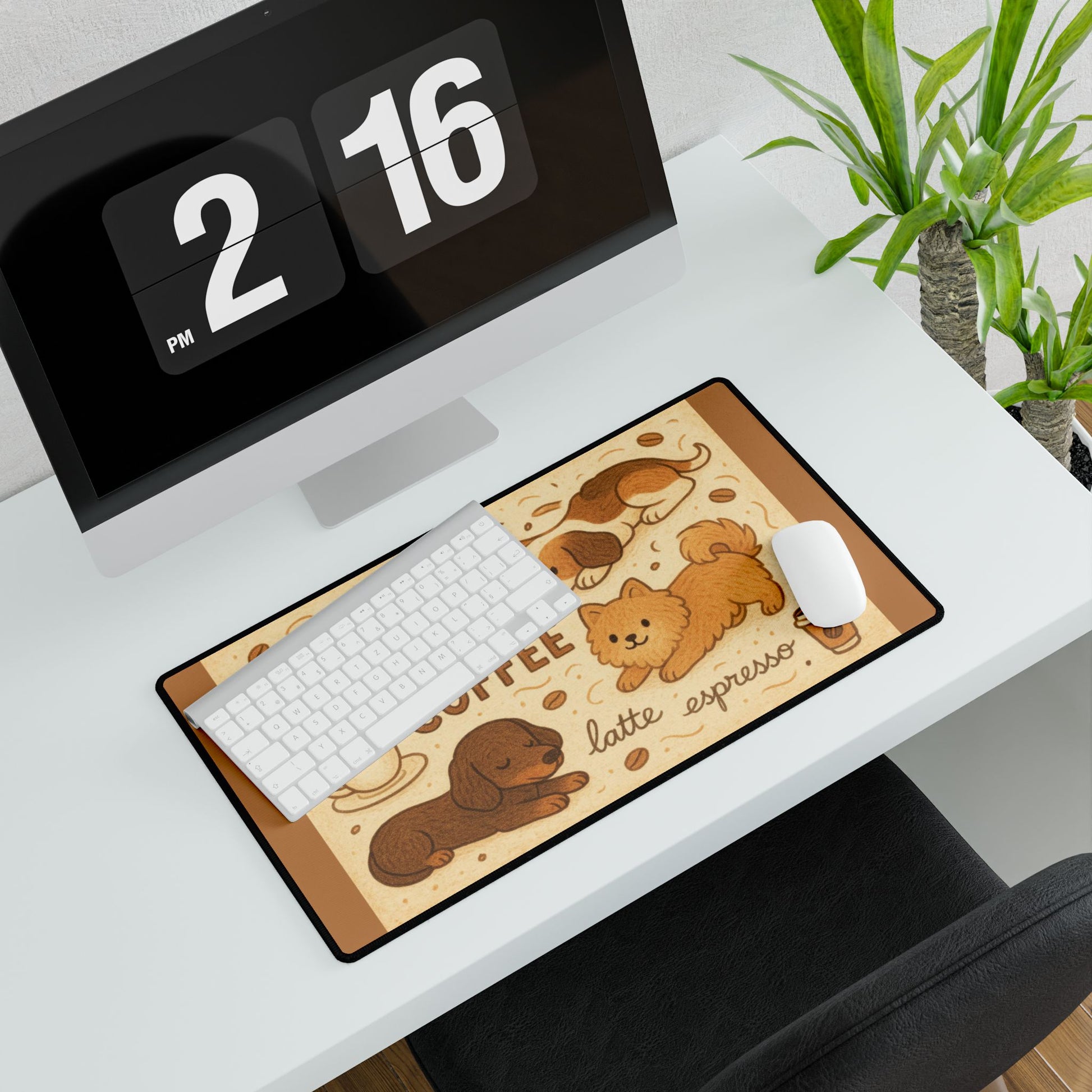 A cozy-soft deskmat featuring adorable hand-drawn pups lounging across a coffee-themed background. It's your daily reminder to take a breath, pet the dog, and sip your coffee slow. Perfect for dog lovers and coffee enthusiasts, this desk mat brings a cozy and relaxed vibe to your workspace. Ideal for home offices, students, and anyone looking to add a touch of cuteness to their desk setup. Great for everyday use or as a thoughtful gift for birthdays, holidays, or as a back-to-school essential.