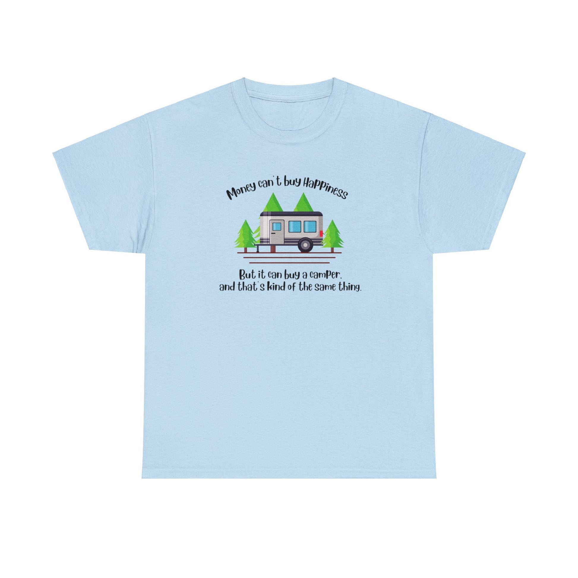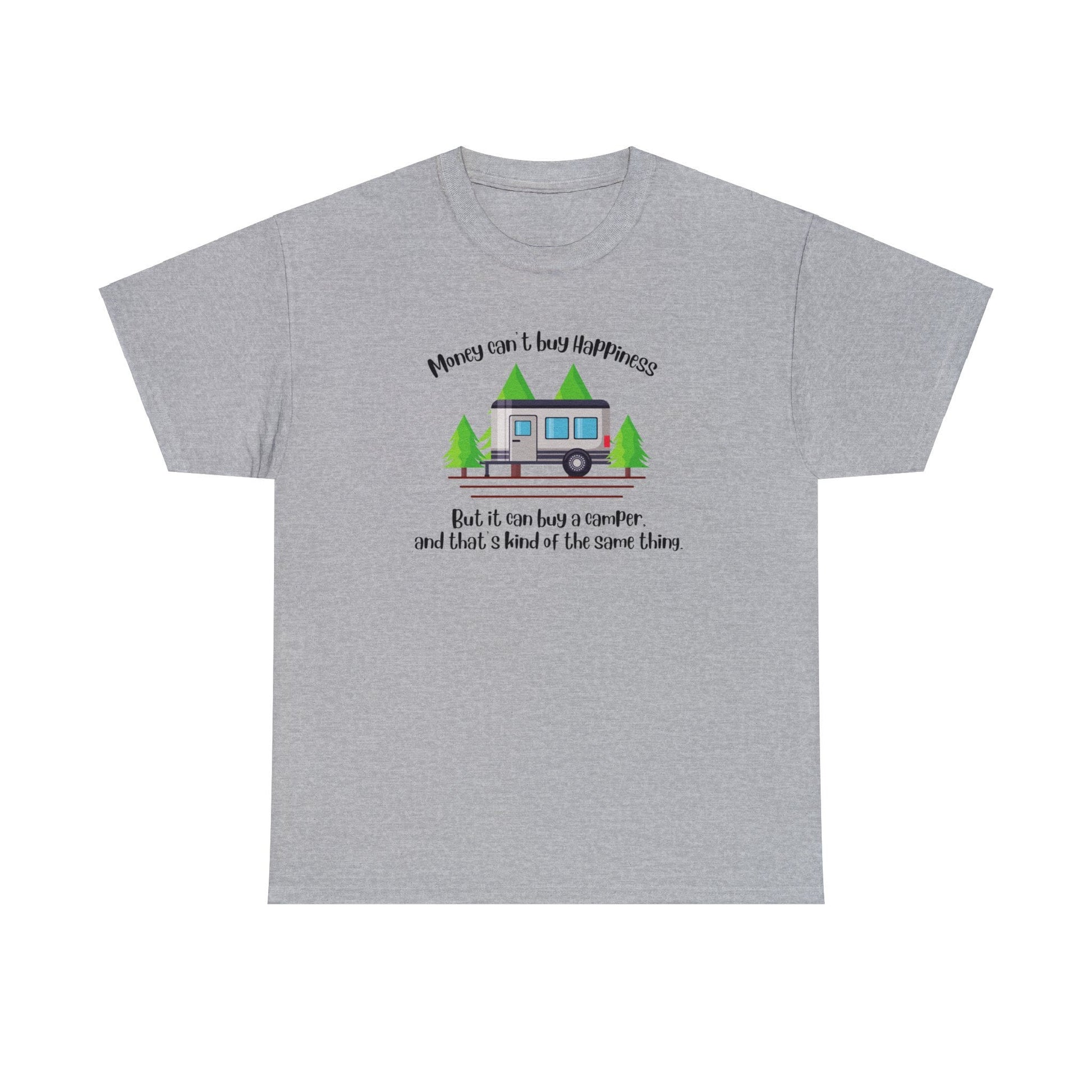 The unisex heavy cotton tee is the perfect gift for the tag-a-long campers in your life, Money can't buy happiness but it can buy a camper, and that's kind of the same thing. No side seams mean there are no itchy interruptions under the arms. The shoulders have tape for improved durability.