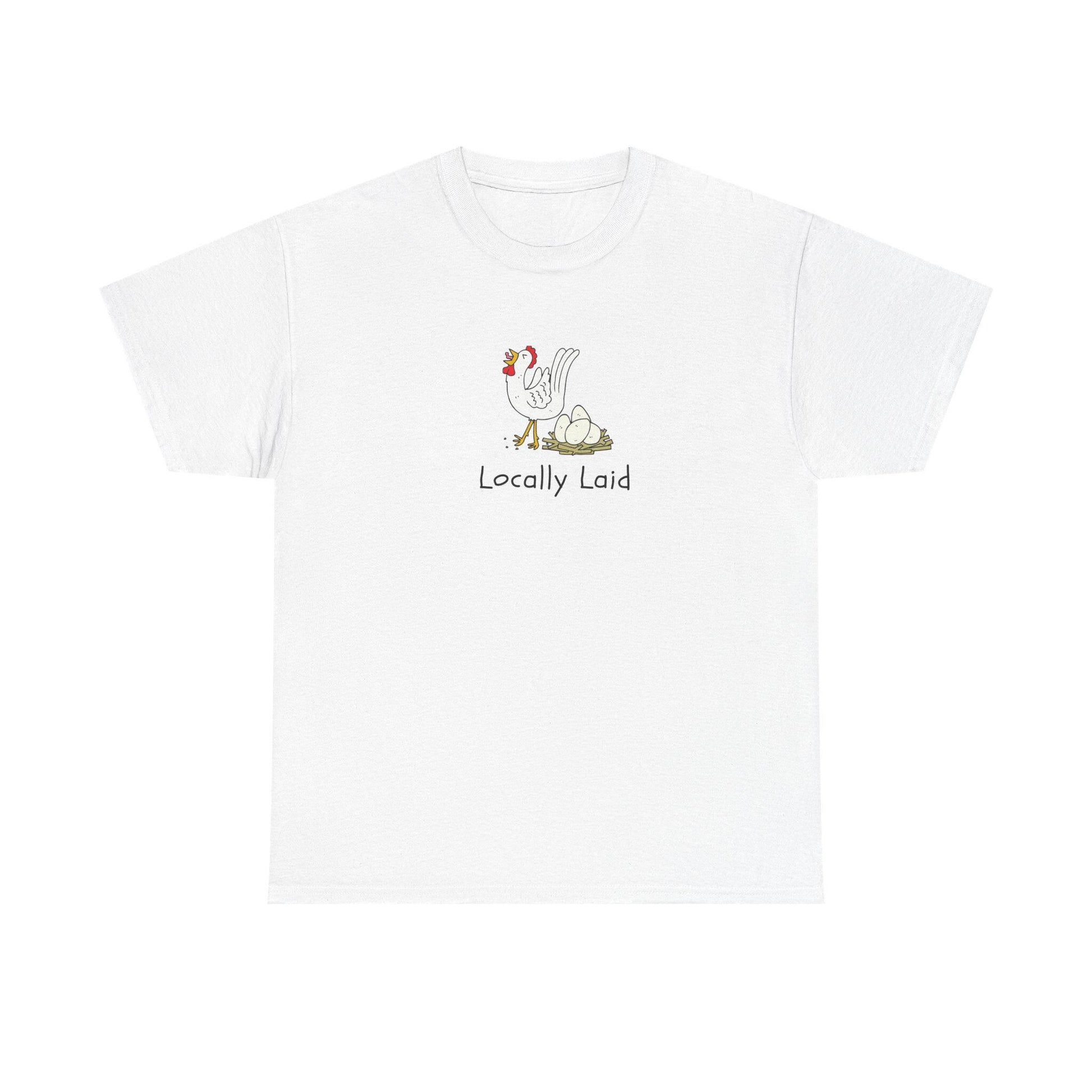 Locally laid, pun on fresh eggs, eggs laid locally, vegan, farm humor, for him, for her, Unisex Heavy Cotton Tee